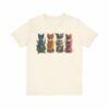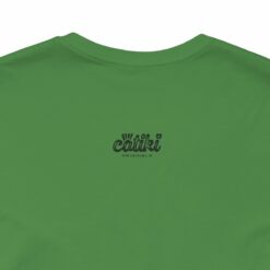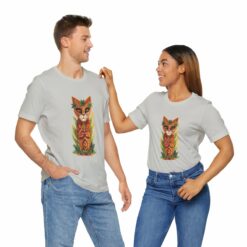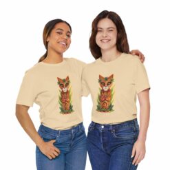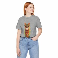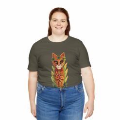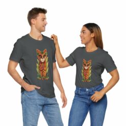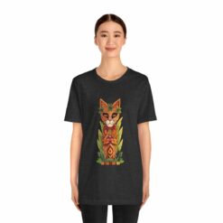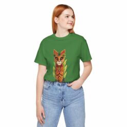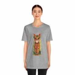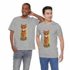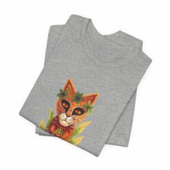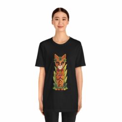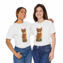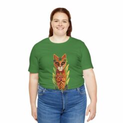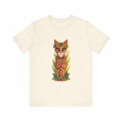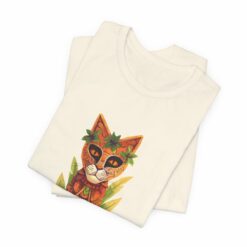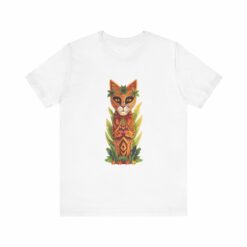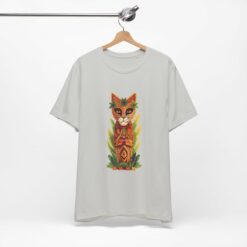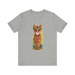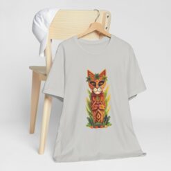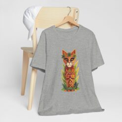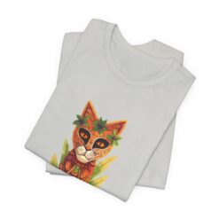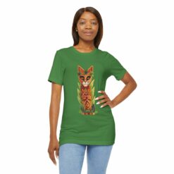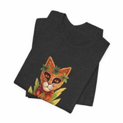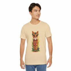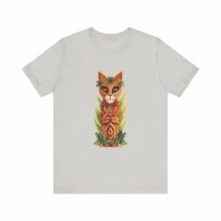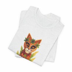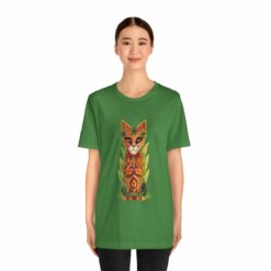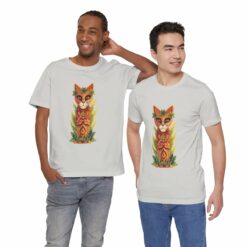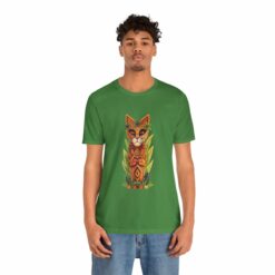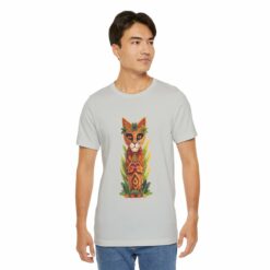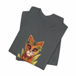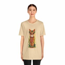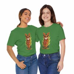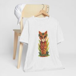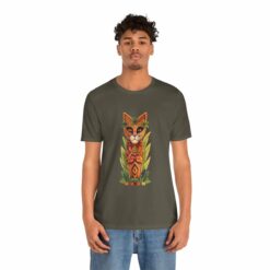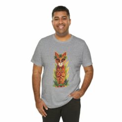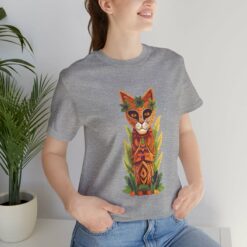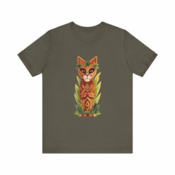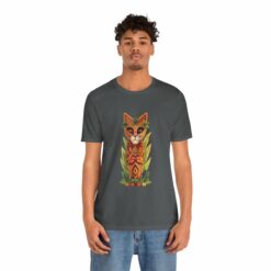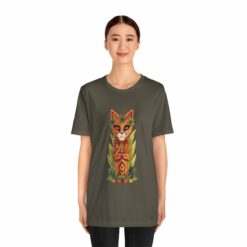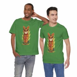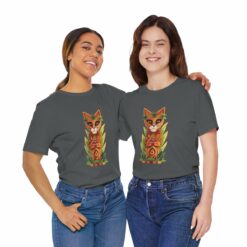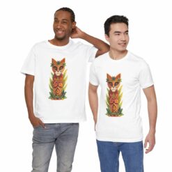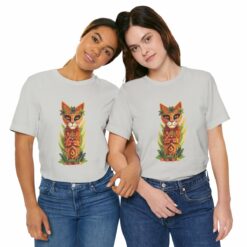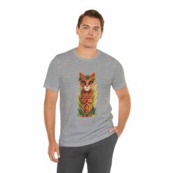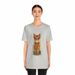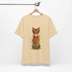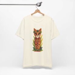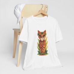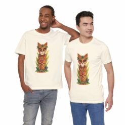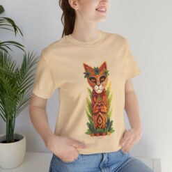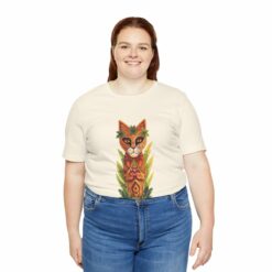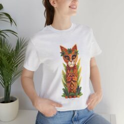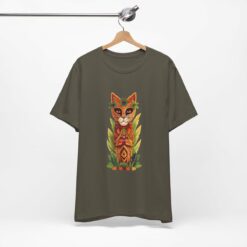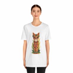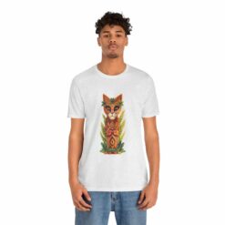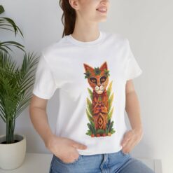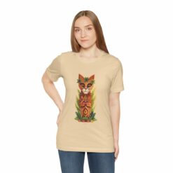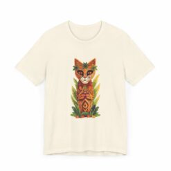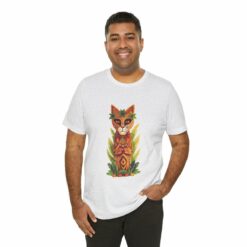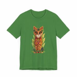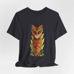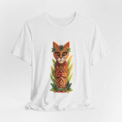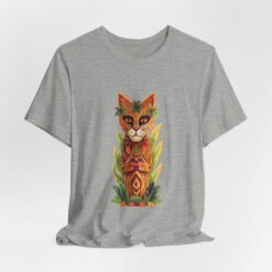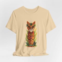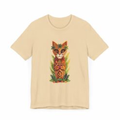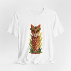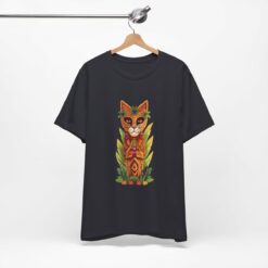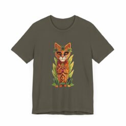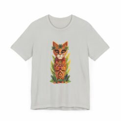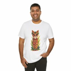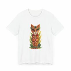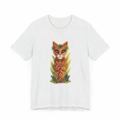 Featured on the t-shirt is a vibrant and detailed graphic of a tiki idol with unique feline characteristics. This whimsical illustration showcases a fierce anthropomorphic cat figure, standing upright with intense eyes and a wide, toothy grin. The figure’s hands are clasped together in front of it, as if guarding a secret. Rich in color, the tiki idol is adorned with intricate Polynesian-inspired patterns and motifs in shades of green, yellow, and red, accentuating its exotic and mystical allure. The stylized depiction, set against the t-shirt’s fabric, transforms the garment into a bold statement piece, perfect for those who wish to wear a touch of mythical charm and a dash of playful spirit.