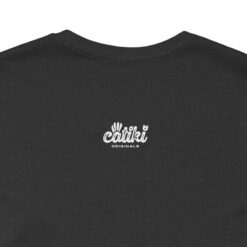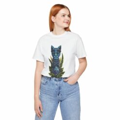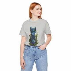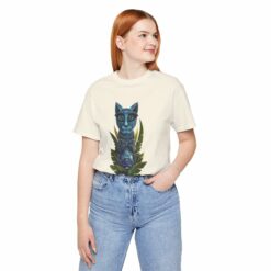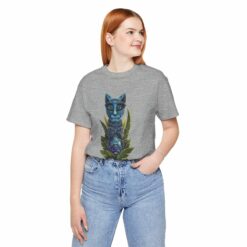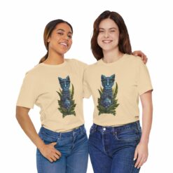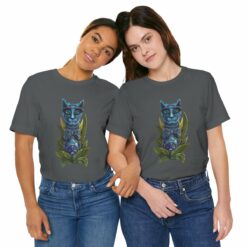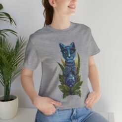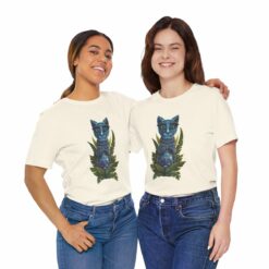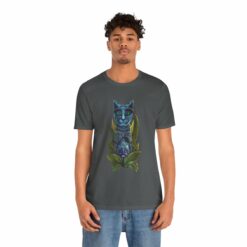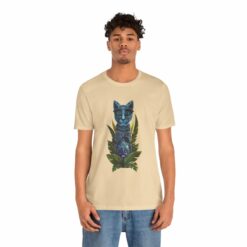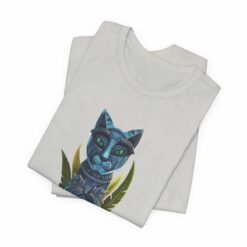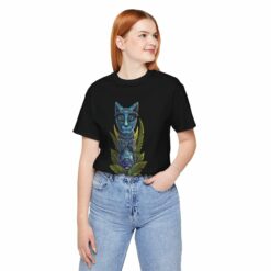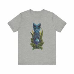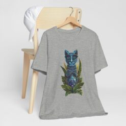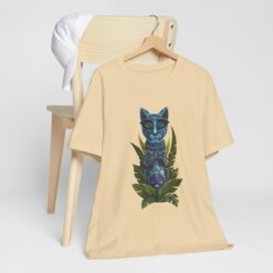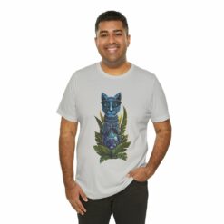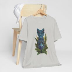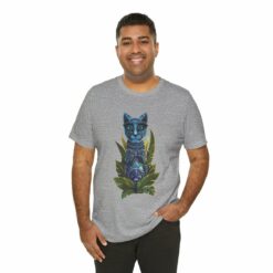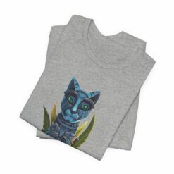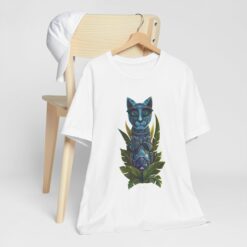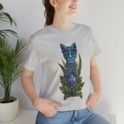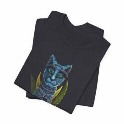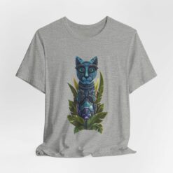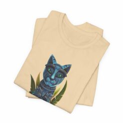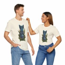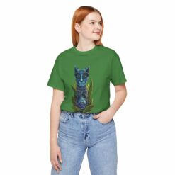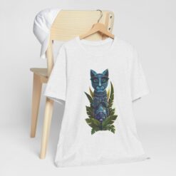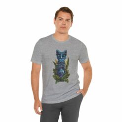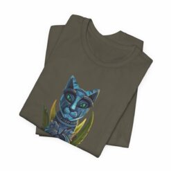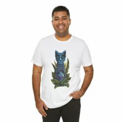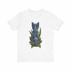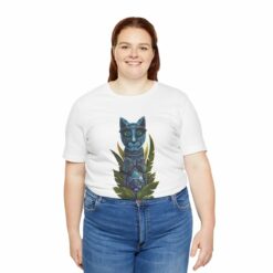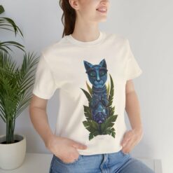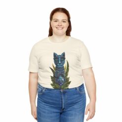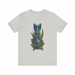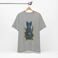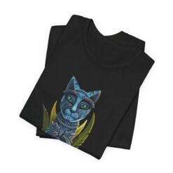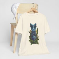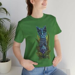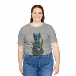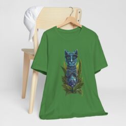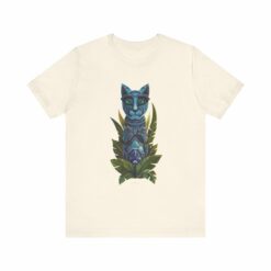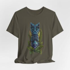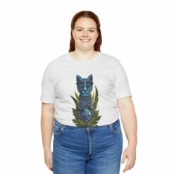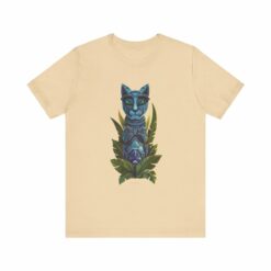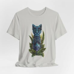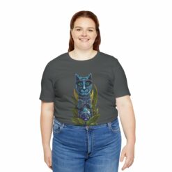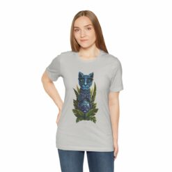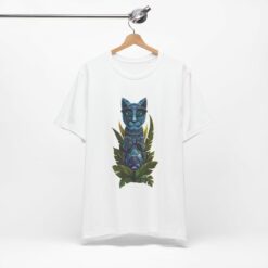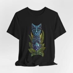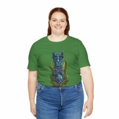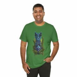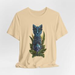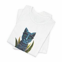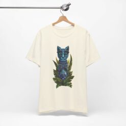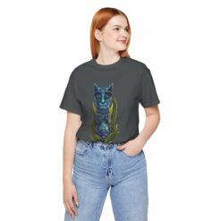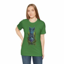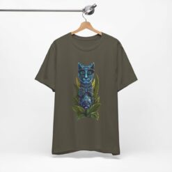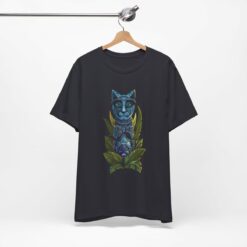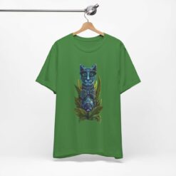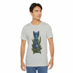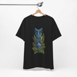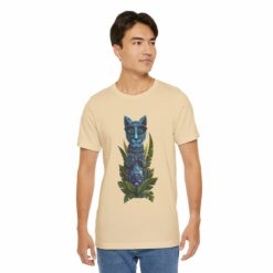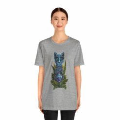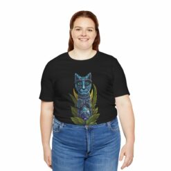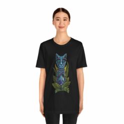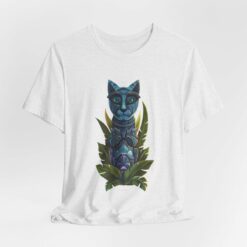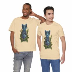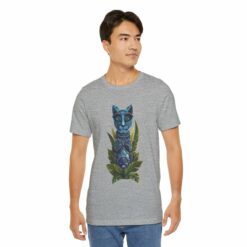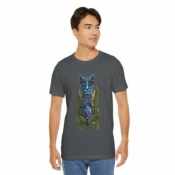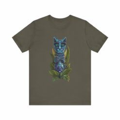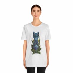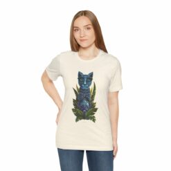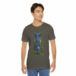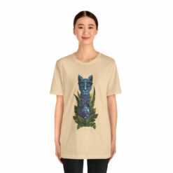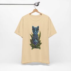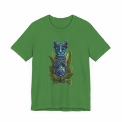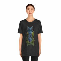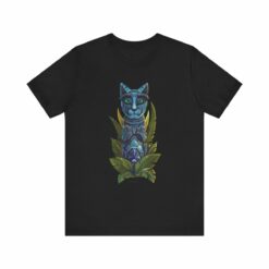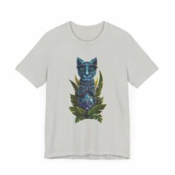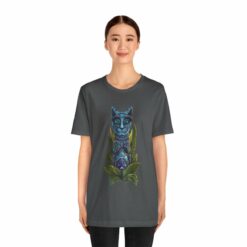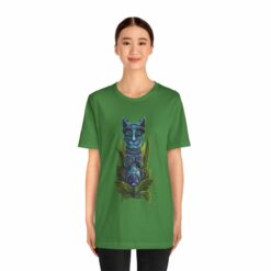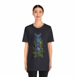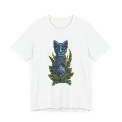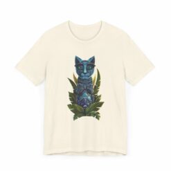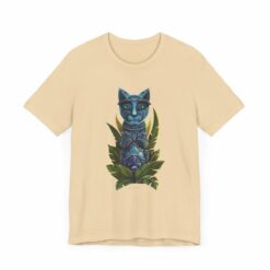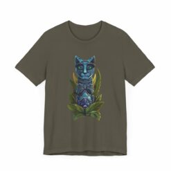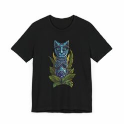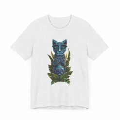 Featured on the t-shirt is a vibrant and detailed graphic of a tiki idol with unique feline characteristics. This whimsical illustration showcases a fierce anthropomorphic cat figure, standing upright with intense eyes and a wide, toothy grin. The figure’s hands are clasped together in front of it, as if guarding a secret. Rich in color, the tiki idol is adorned with intricate Polynesian-inspired patterns and motifs in shades of green, yellow, and red, accentuating its exotic and mystical allure. The stylized depiction, set against the t-shirt’s fabric, transforms the garment into a bold statement piece, perfect for those who wish to wear a touch of mythical charm and a dash of playful spirit.