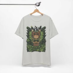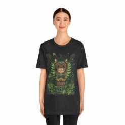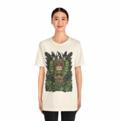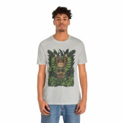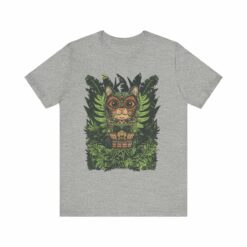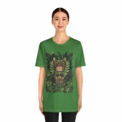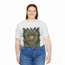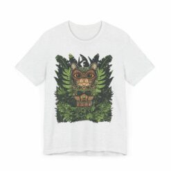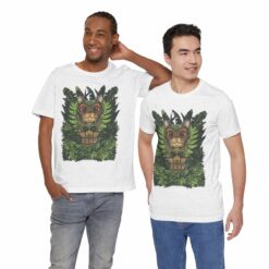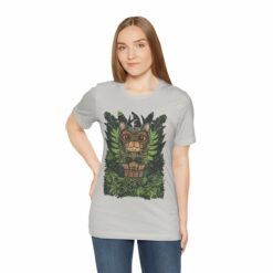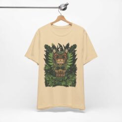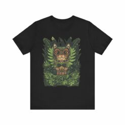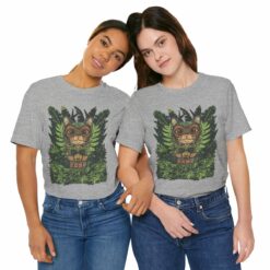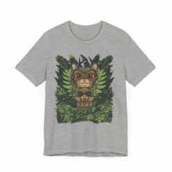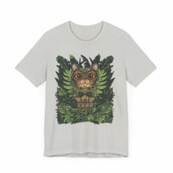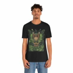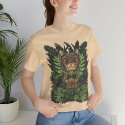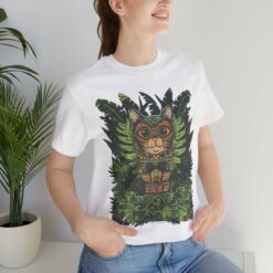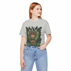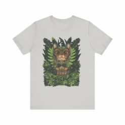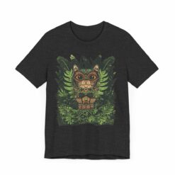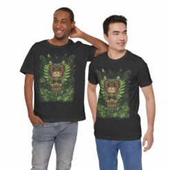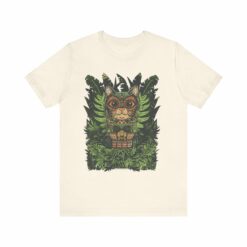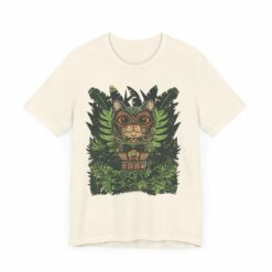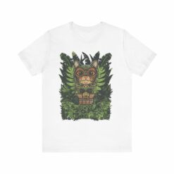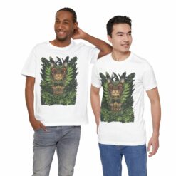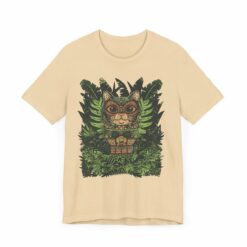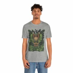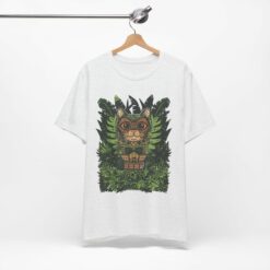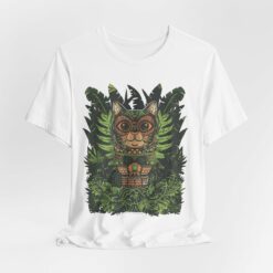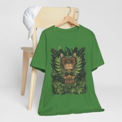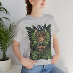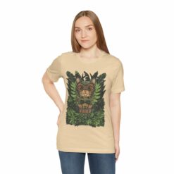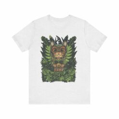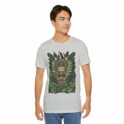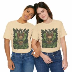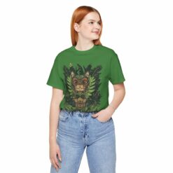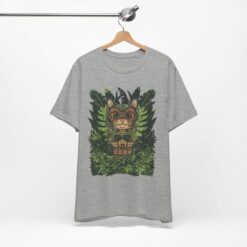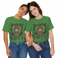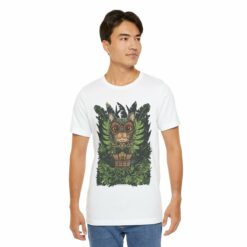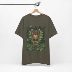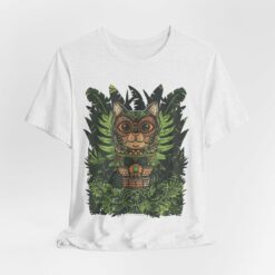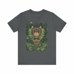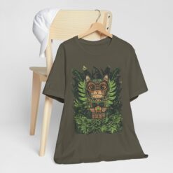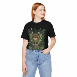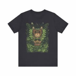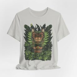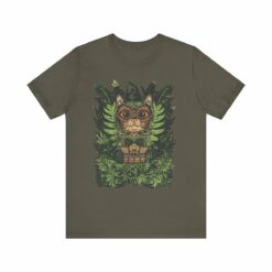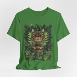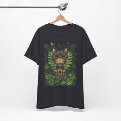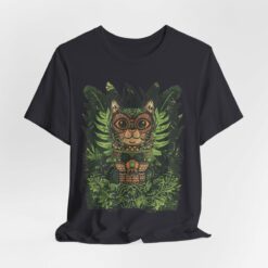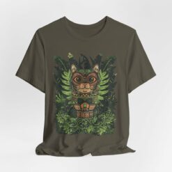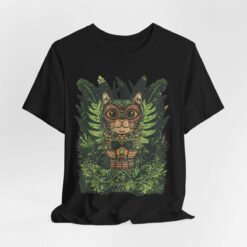 Featured on the t-shirt is a vibrant and detailed graphic of a tiki idol with unique feline characteristics. This whimsical illustration showcases a fierce anthropomorphic cat figure, standing upright with intense eyes and a wide, toothy grin. The figure’s hands are clasped together in front of it, as if guarding a secret. Rich in color, the tiki idol is adorned with intricate Polynesian-inspired patterns and motifs in shades of green, yellow, and red, accentuating its exotic and mystical allure. The stylized depiction, set against the t-shirt’s fabric, transforms the garment into a bold statement piece, perfect for those who wish to wear a touch of mythical charm and a dash of playful spirit.