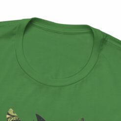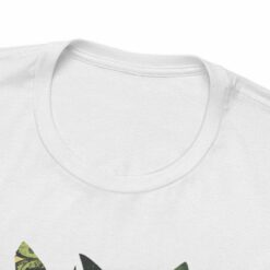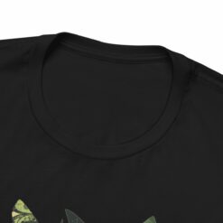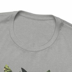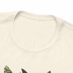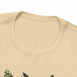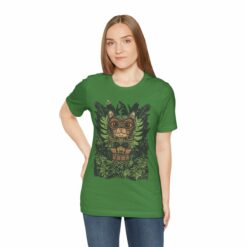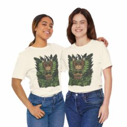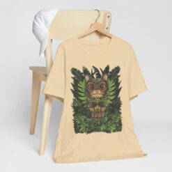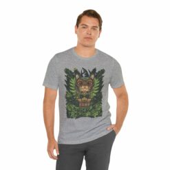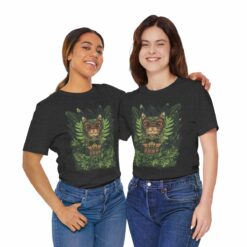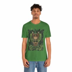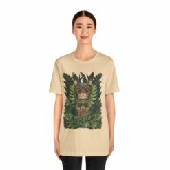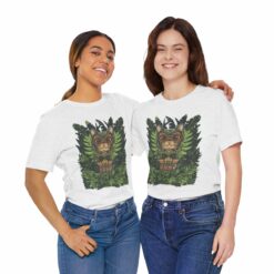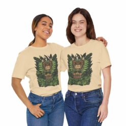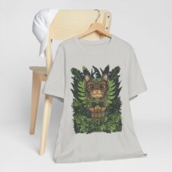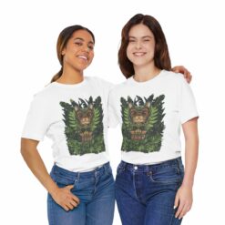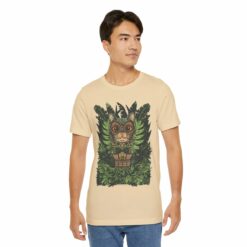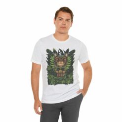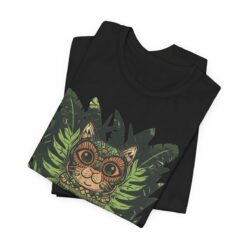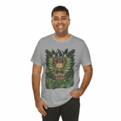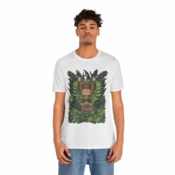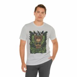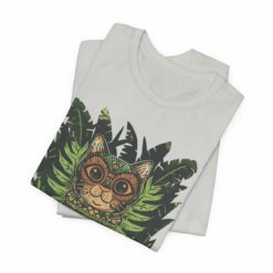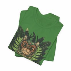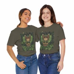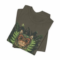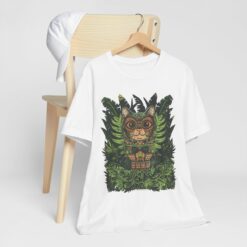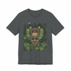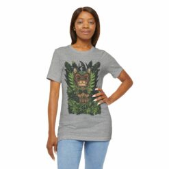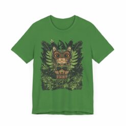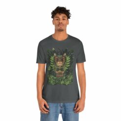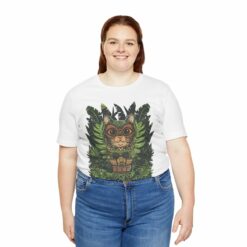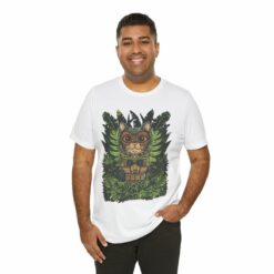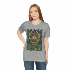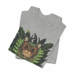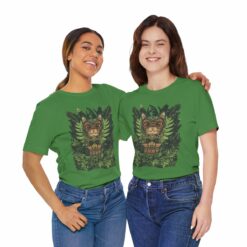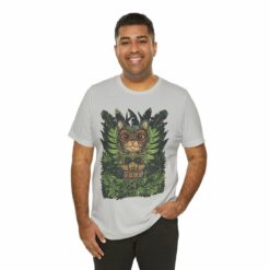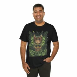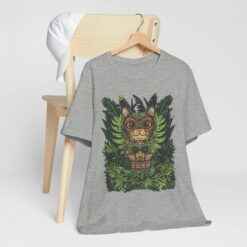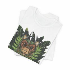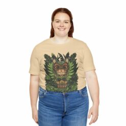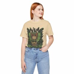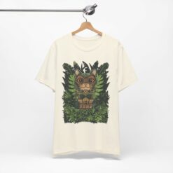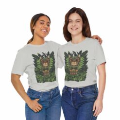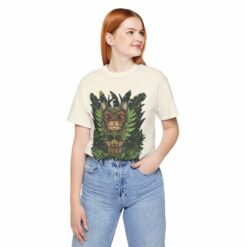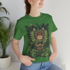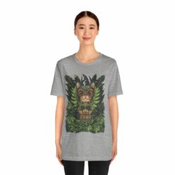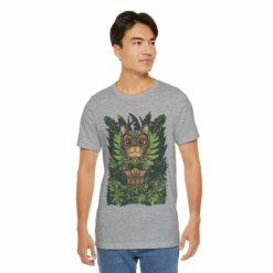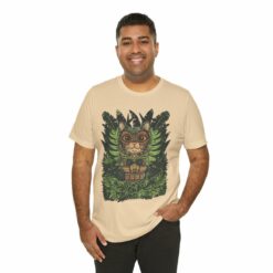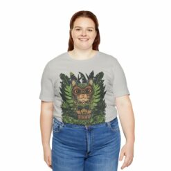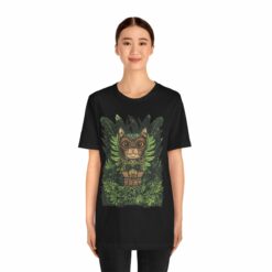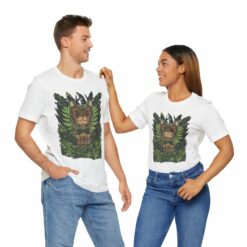 Featured on the t-shirt is a vibrant and detailed graphic of a tiki idol with unique feline characteristics. This whimsical illustration showcases a fierce anthropomorphic cat figure, standing upright with intense eyes and a wide, toothy grin. The figure’s hands are clasped together in front of it, as if guarding a secret. Rich in color, the tiki idol is adorned with intricate Polynesian-inspired patterns and motifs in shades of green, yellow, and red, accentuating its exotic and mystical allure. The stylized depiction, set against the t-shirt’s fabric, transforms the garment into a bold statement piece, perfect for those who wish to wear a touch of mythical charm and a dash of playful spirit.