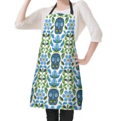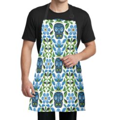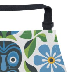 Dive into tropical splendor with the Ocean Bloom Tiki Apron, a vibrant design featuring bold tiki masks framed by blooming blue flowers and lush green leaves. The interplay of crisp blues, deep greens, and striking black accents evokes the feeling of a seaside garden in full bloom. With its playful yet powerful pattern, this apron embodies the energy of a lively luau and the serenity of ocean breezes, making it the perfect companion for your culinary adventures.