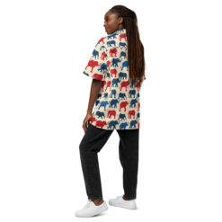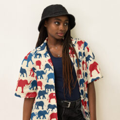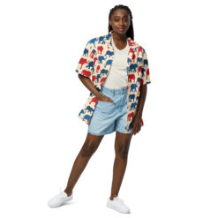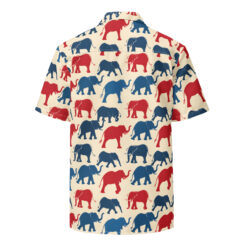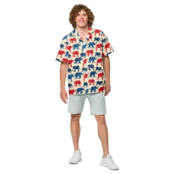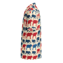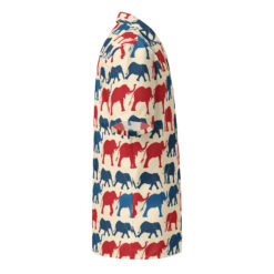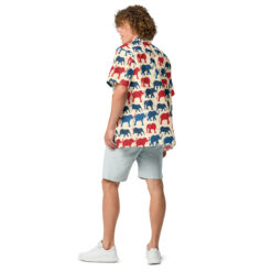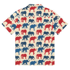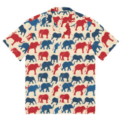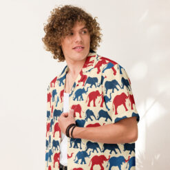 Introducing our vibrant Hawaiian shirt design, adorned with a delightful array of patriotic elephants. This pattern features an eye-catching blend of red and blue elephants, marching proudly across a creamy background. Each elephant is illustrated with bold lines and playful curves, capturing the majestic essence of these magnificent creatures while adding a touch of whimsical charm.