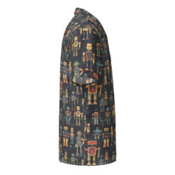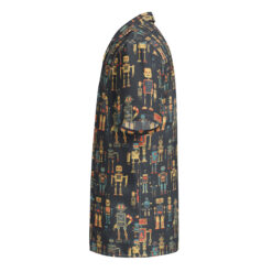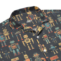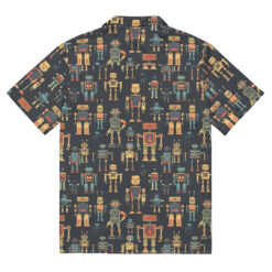 Introducing our Retro Robot Hawaiian Shirt, a fun and unique addition to your wardrobe! This shirt features a captivating pattern of whimsical, vintage-style robots that are sure to make a statement. Each robot is uniquely designed with vibrant colors like red, blue, yellow, and orange, set against a dark navy blue background that makes the designs pop. The playful robots, with their retro aesthetics and slightly distressed textures, bring a nostalgic charm to modern fashion.