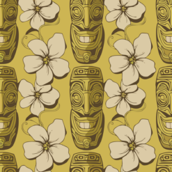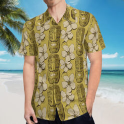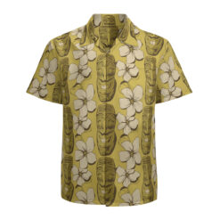 The Tiki Bloom Reverie Shirt is an ode to the vibrant energy of tiki culture, blending vintage charm with tropical elegance. Featuring hand-carved-style tiki masks with beaming smiles surrounded by soft floral blossoms, the design bursts to life against a warm, golden-yellow backdrop. The flowing vine accents add a sense of movement, evoking the swaying of island flora in a gentle breeze. This pattern is a celebration of tradition and whimsy, making it the perfect statement piece for tiki aficionados who love bold style.