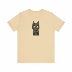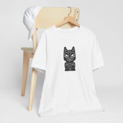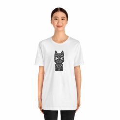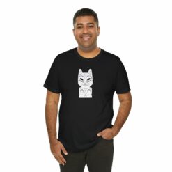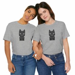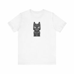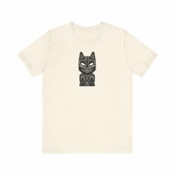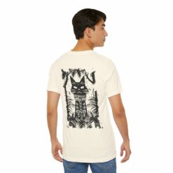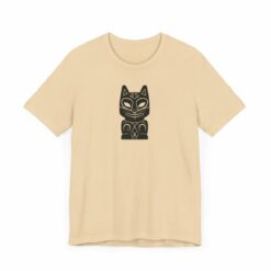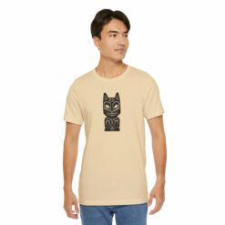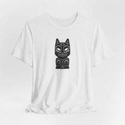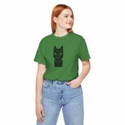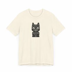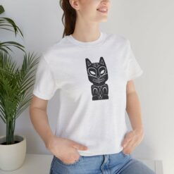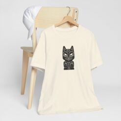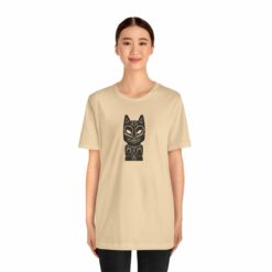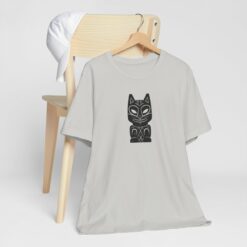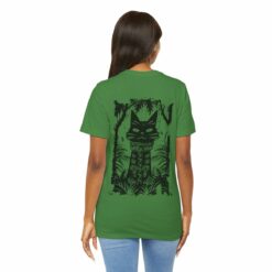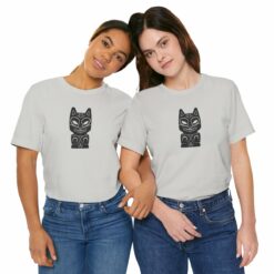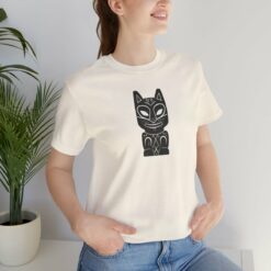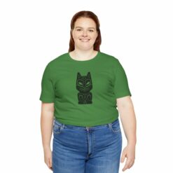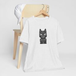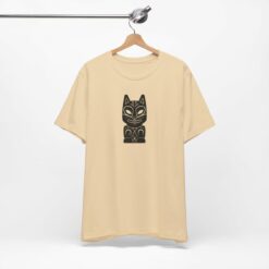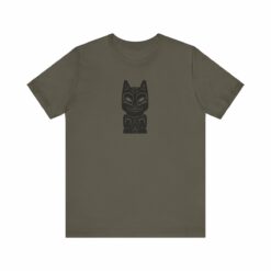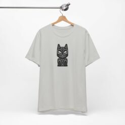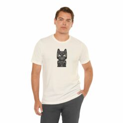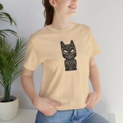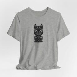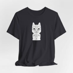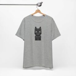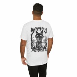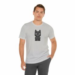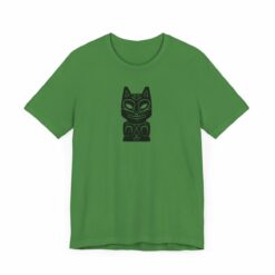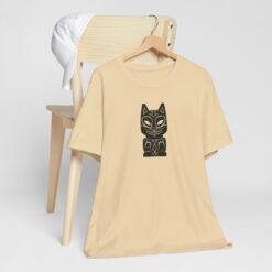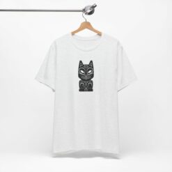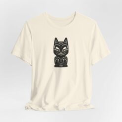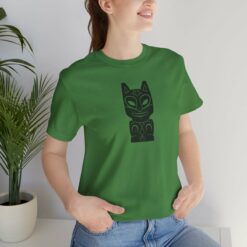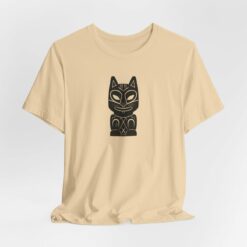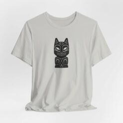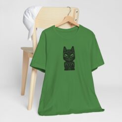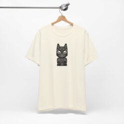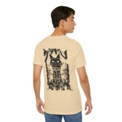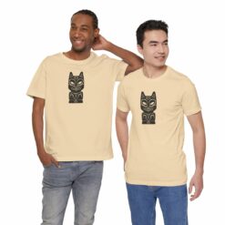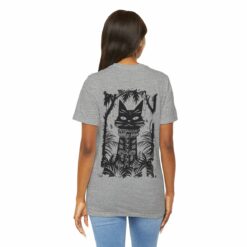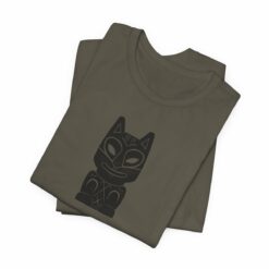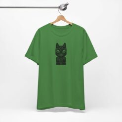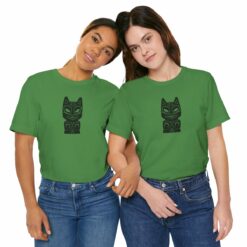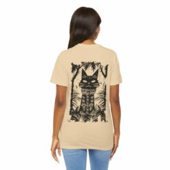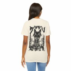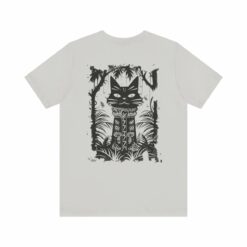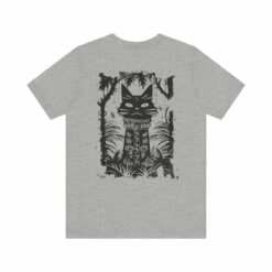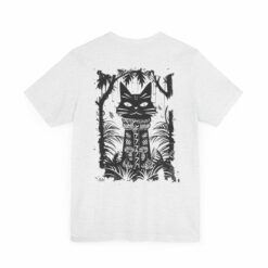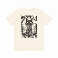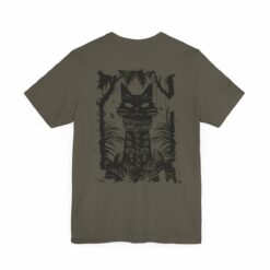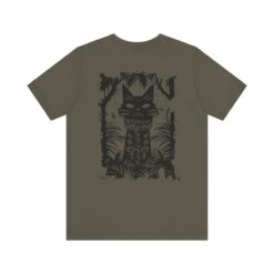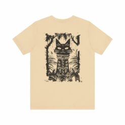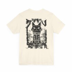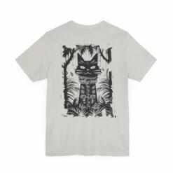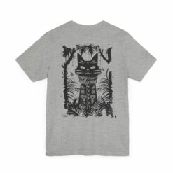 Featured on the t-shirt is a vibrant and detailed graphic of a tiki idol with unique feline characteristics. This whimsical illustration showcases a fierce anthropomorphic cat figure, standing upright with intense eyes and a wide, toothy grin. The figure’s hands are clasped together in front of it, as if guarding a secret. Rich in color, the tiki idol is adorned with intricate Polynesian-inspired patterns and motifs in shades of green, yellow, and red, accentuating its exotic and mystical allure. The stylized depiction, set against the t-shirt’s fabric, transforms the garment into a bold statement piece, perfect for those who wish to wear a touch of mythical charm and a dash of playful spirit.
