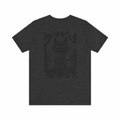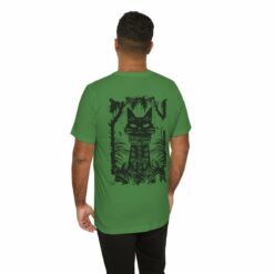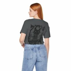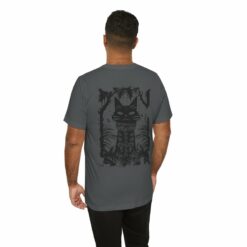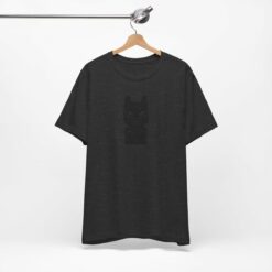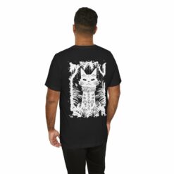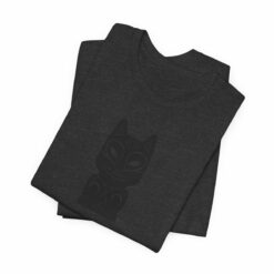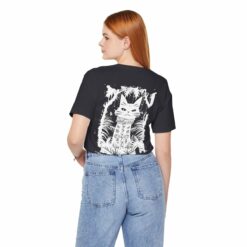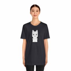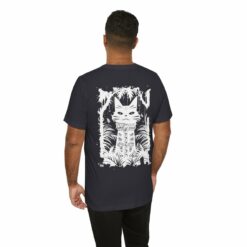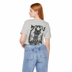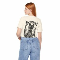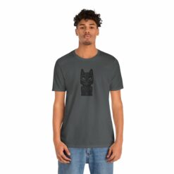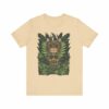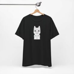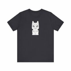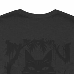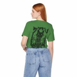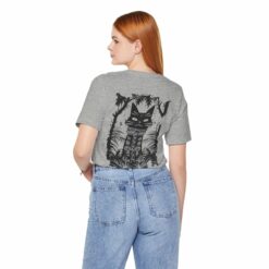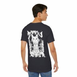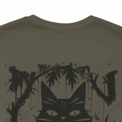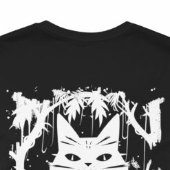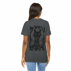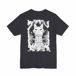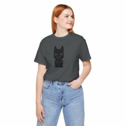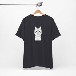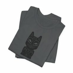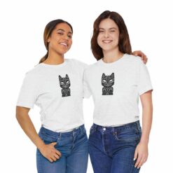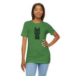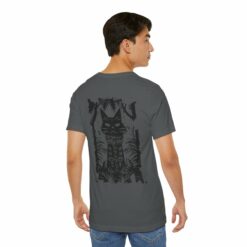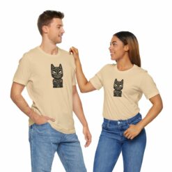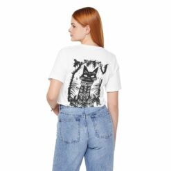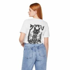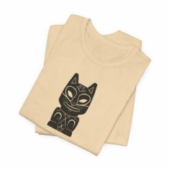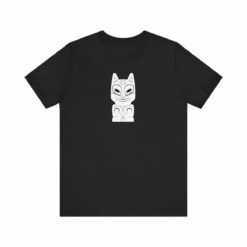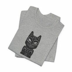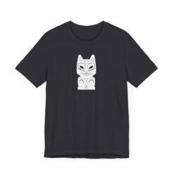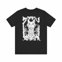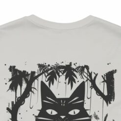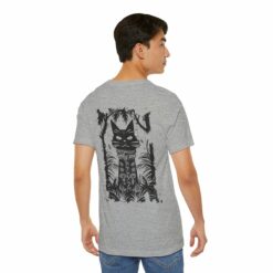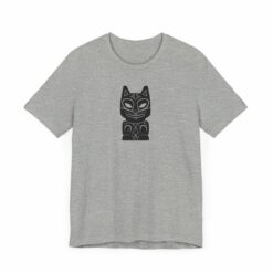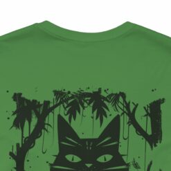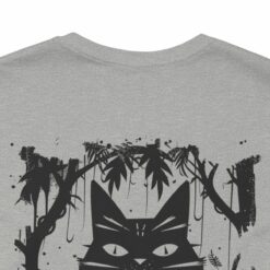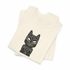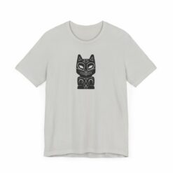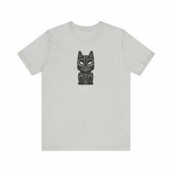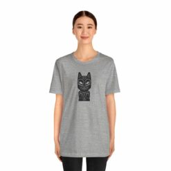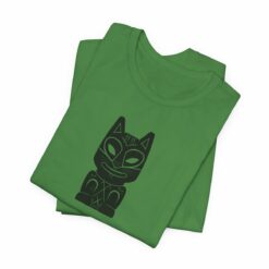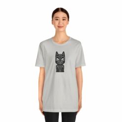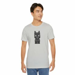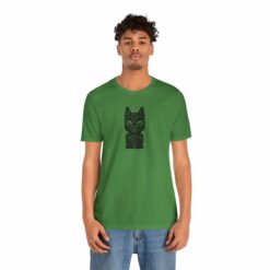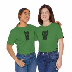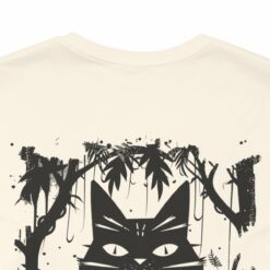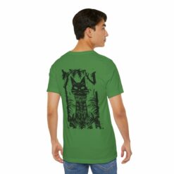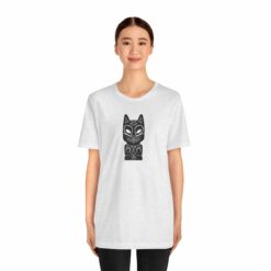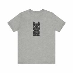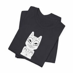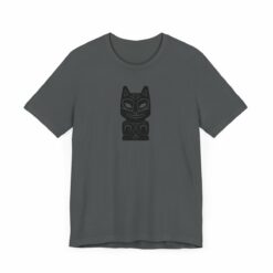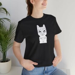 Featured on the t-shirt is a vibrant and detailed graphic of a tiki idol with unique feline characteristics. This whimsical illustration showcases a fierce anthropomorphic cat figure, standing upright with intense eyes and a wide, toothy grin. The figure’s hands are clasped together in front of it, as if guarding a secret. Rich in color, the tiki idol is adorned with intricate Polynesian-inspired patterns and motifs in shades of green, yellow, and red, accentuating its exotic and mystical allure. The stylized depiction, set against the t-shirt’s fabric, transforms the garment into a bold statement piece, perfect for those who wish to wear a touch of mythical charm and a dash of playful spirit.