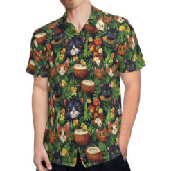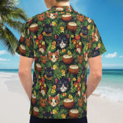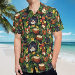 The Tiki Cat Coconut Paradise Shirt is a tropical dream come true for cat lovers and tiki enthusiasts alike. Set against a lush backdrop of vibrant palm leaves and blooming hibiscus flowers, this playful design features curious feline faces peeking out from coconut shells, adding a quirky twist to island style. With rich tones of emerald, amber, and crimson, this shirt captures the essence of island living—where every sip of coconut water is shared with a mischievous furry friend.