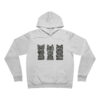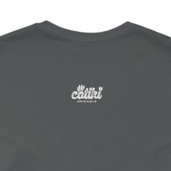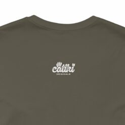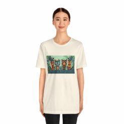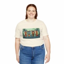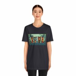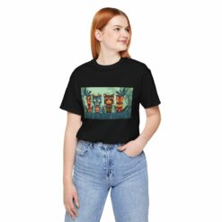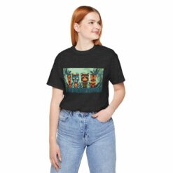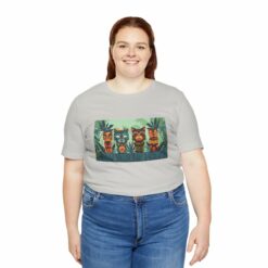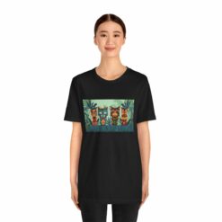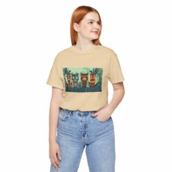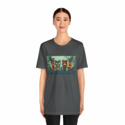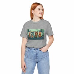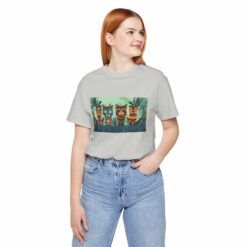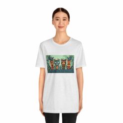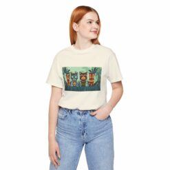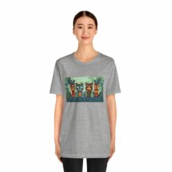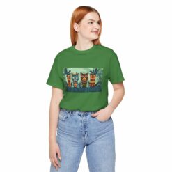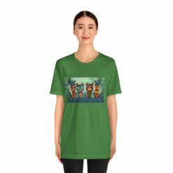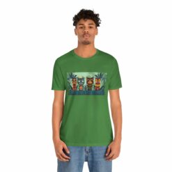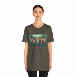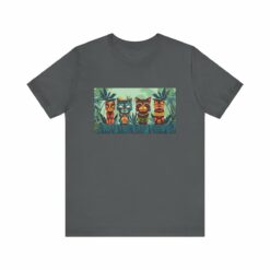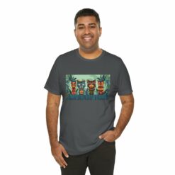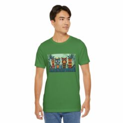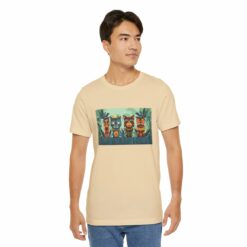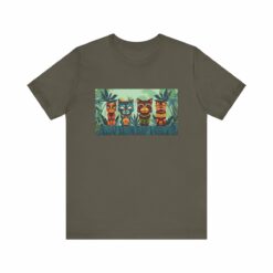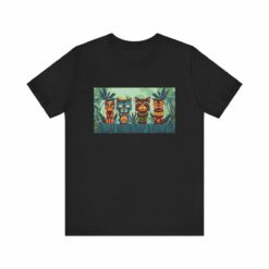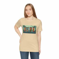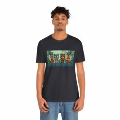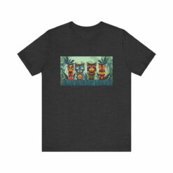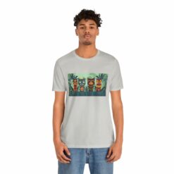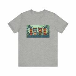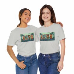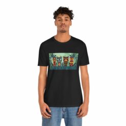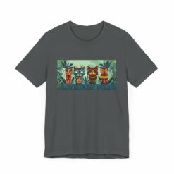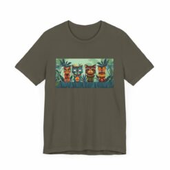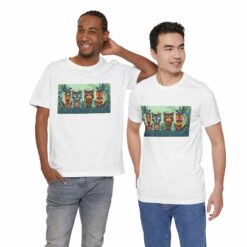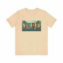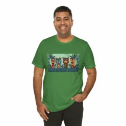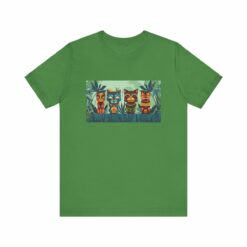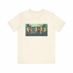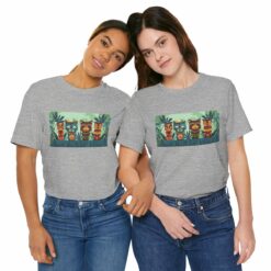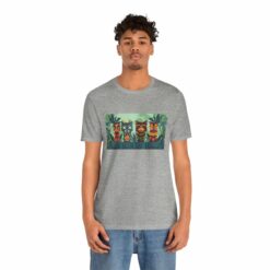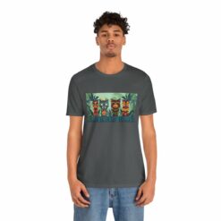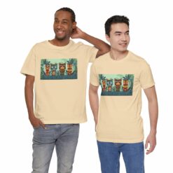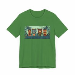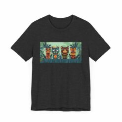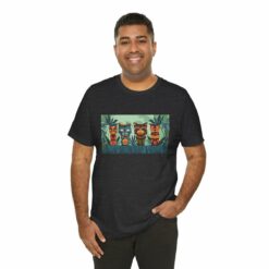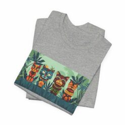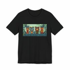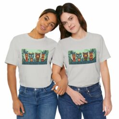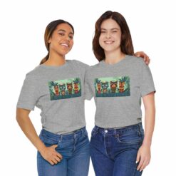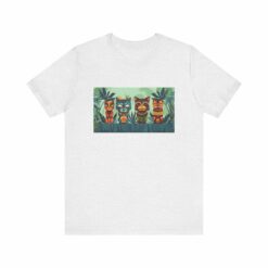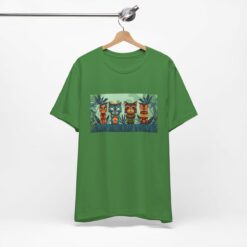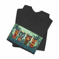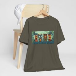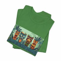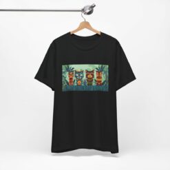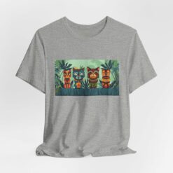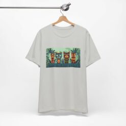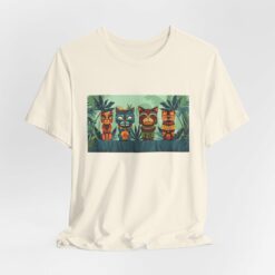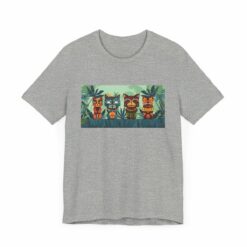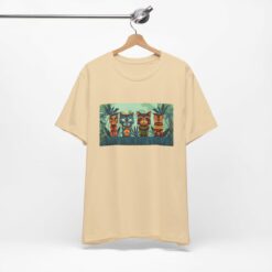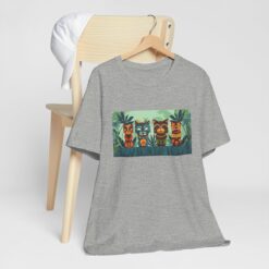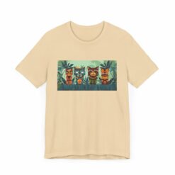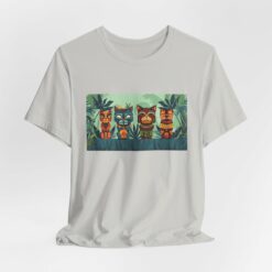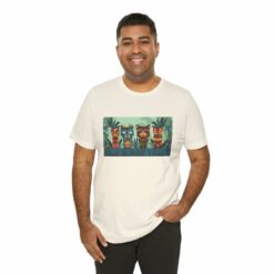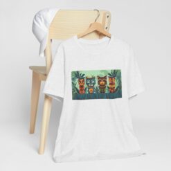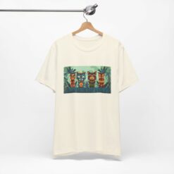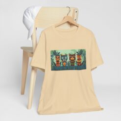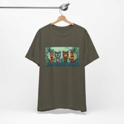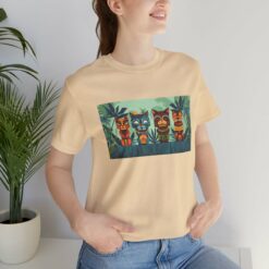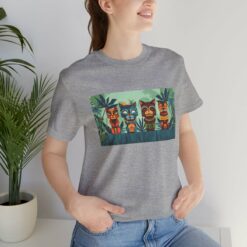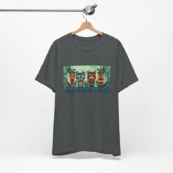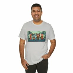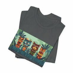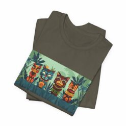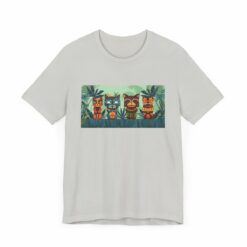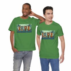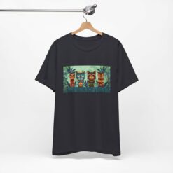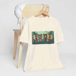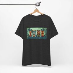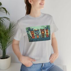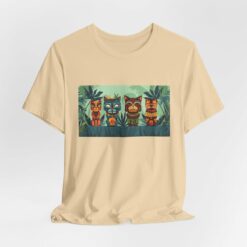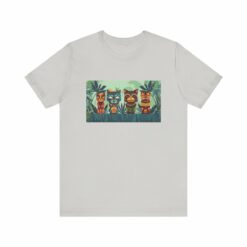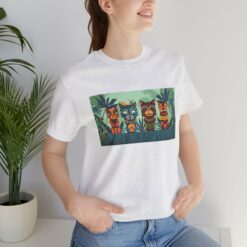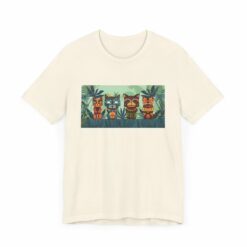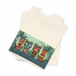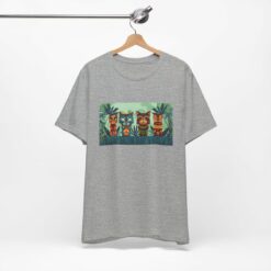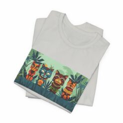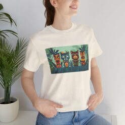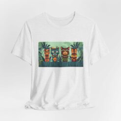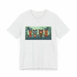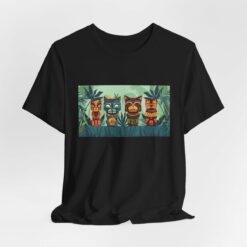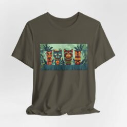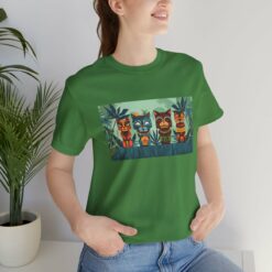 Featured on the t-shirt is a vibrant and detailed graphic of a tiki idol with unique feline characteristics. This whimsical illustration showcases a fierce anthropomorphic cat figure, standing upright with intense eyes and a wide, toothy grin. The figure’s hands are clasped together in front of it, as if guarding a secret. Rich in color, the tiki idol is adorned with intricate Polynesian-inspired patterns and motifs in shades of green, yellow, and red, accentuating its exotic and mystical allure. The stylized depiction, set against the t-shirt’s fabric, transforms the garment into a bold statement piece, perfect for those who wish to wear a touch of mythical charm and a dash of playful spirit.
