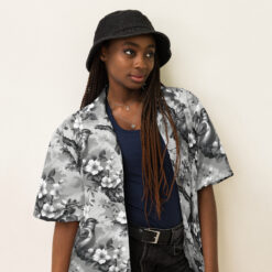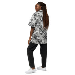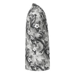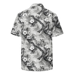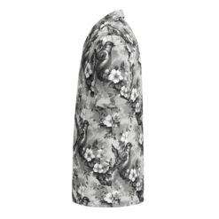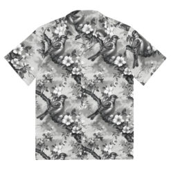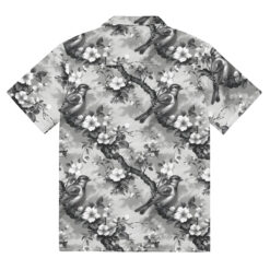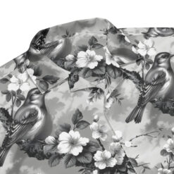 The pattern on this shirt features a beautifully detailed bird perched among blooming flowers and intricate branches, all rendered in shades of black, white, and grey. The meticulous artistry captures the essence of a peaceful garden scene, evoking a sense of calm and connection with nature. This design is inspired by the balance and harmony found in nature, reminiscent of serene moments spent in a quiet garden.
