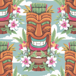 The bold Tiki mask pattern is brought to life with tropical flowers, lush green leaves, and a soothing pastel sky-blue backdrop—reminiscent of an idyllic island morning. Each detail, from the carved lines of the Tiki faces to the dynamic pops of magenta, green, and orange, pays homage to the rich tradition of Tiki art while embracing the fun-loving spirit of Hawaiian shirts. This design celebrates the escapism of Polynesian pop culture, perfect for beach parties, luaus, or your next tropical vacation.