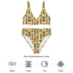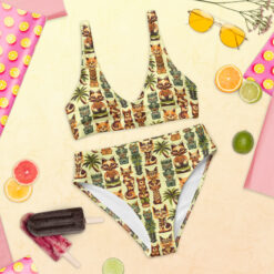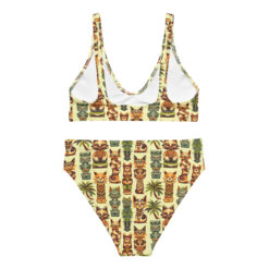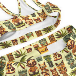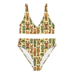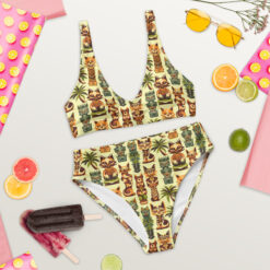 Embrace the spirit of island whimsy with our latest beachwear collection, “Tiki Tabby.” Each piece in this exquisite line is adorned with a mosaic of mythic feline deities, rendered in a palette borrowed from a tropical sunset — rich ambers, lush greens, and the soft golds of a sun-kissed beach.