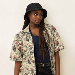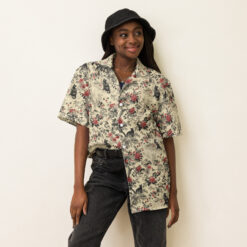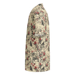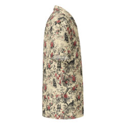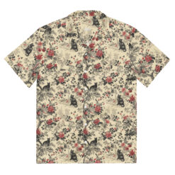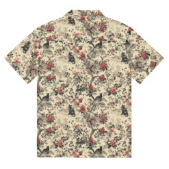 Each shirt is a work of art, with the detailed floral motifs and lifelike depictions of curious cats blending seamlessly into the background. The delicate balance of colors—bold reds and soothing greens against a cream backdrop—enhances the intricate beauty of the pattern, making it a standout piece in any wardrobe.
