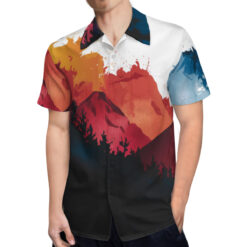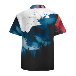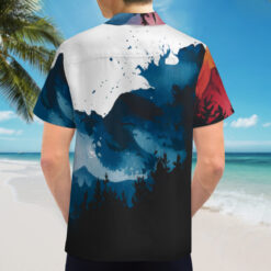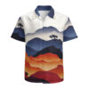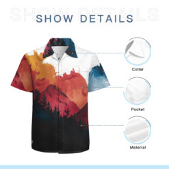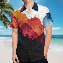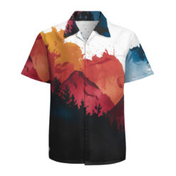The design displayed on this classic Hawaiian shirt is an explosion of tropical vibrancy and motifs rooted in Tiki culture. Dominated by lush botanical elements, the pattern features oversized hibiscus flowers, palm fronds, and vibrant bird-of-paradise blooms intertwined with traditional Polynesian-inspired iconography. Interspersed are tiki masks rendered in rich wood-like textures, glowing torches, and stylized waves evocative of ocean currents. The bold, earthy tones of burnt orange, deep green, and golden yellow are offset by tranquil blues, echoing the serene yet lively essence of the islands.